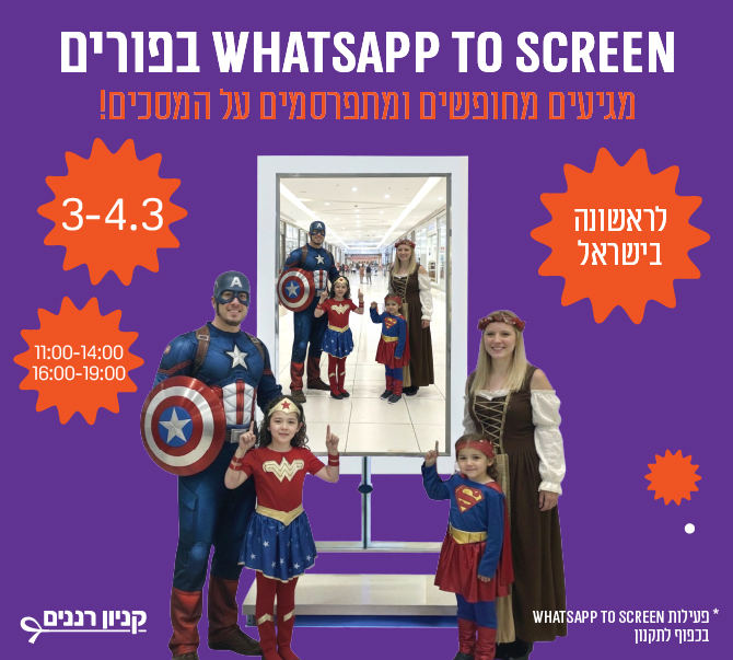 התמונות שתבחרו יעלו מהווטסאפ שלכם ויתפרסמו ישר במסכי הקניון!!